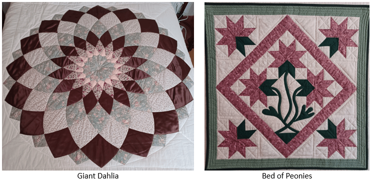 My passion for patchwork quilts really started in 1990: at that time, patchwork was not widely known in France, and Le Rouvray, in Paris, was THE reference for quilts makers, providing all type of materials and classes. It is closed now, but a webpage still exists: http://www.lerouvray.com/index.html. I thus enrolled in a first weekend programme in October 1990, during which I learned piecing and quilting techniques, and a year later, I attended a second one to learn the appliqué technique and quilting on a frame. Then I implemented what I had learned through several small projects, from cushions to baby bedcovers. When I discovered that I was skilled enough to use my newly acquired sewing machine for assembling the small pieces of fabrics together, I started bigger projects including curved pieces, such as Giant Dahlia throws and bedcovers, and wall-hangings. I also started to mix machine quilting “in the ditch” and decorative hand-quilting.